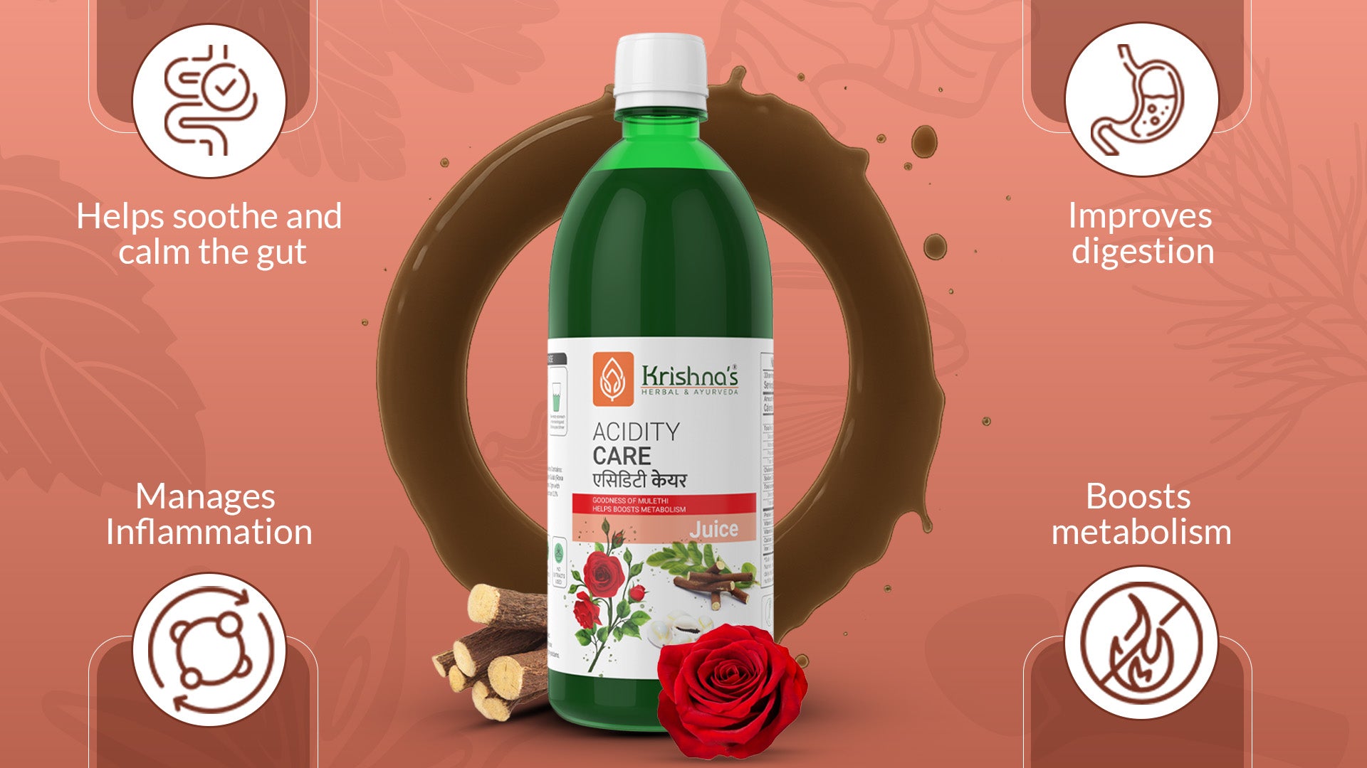 Acidity Care Juice combines Mulethi, Gulab, and Kabad Bhasma to help manage acidity, gas, and indigestion. Mulethi regulates acid levels, Gulab supports bowel movements, and Kabad Bhasma aids in acid regulation and liver wellness—together promoting better digestion and metabolic balance naturally through Ayurvedic principles.