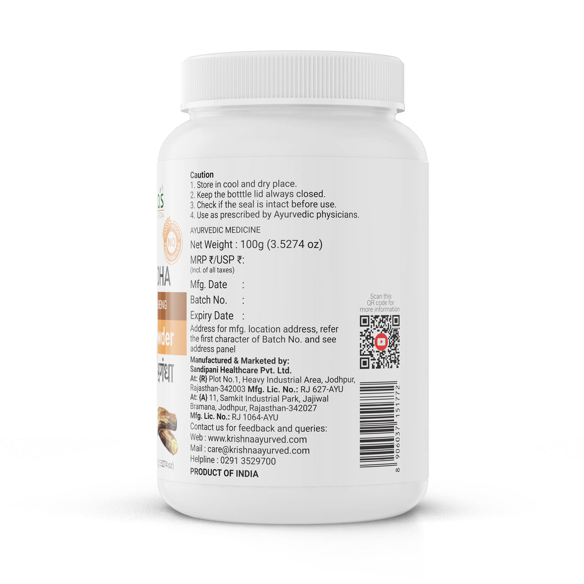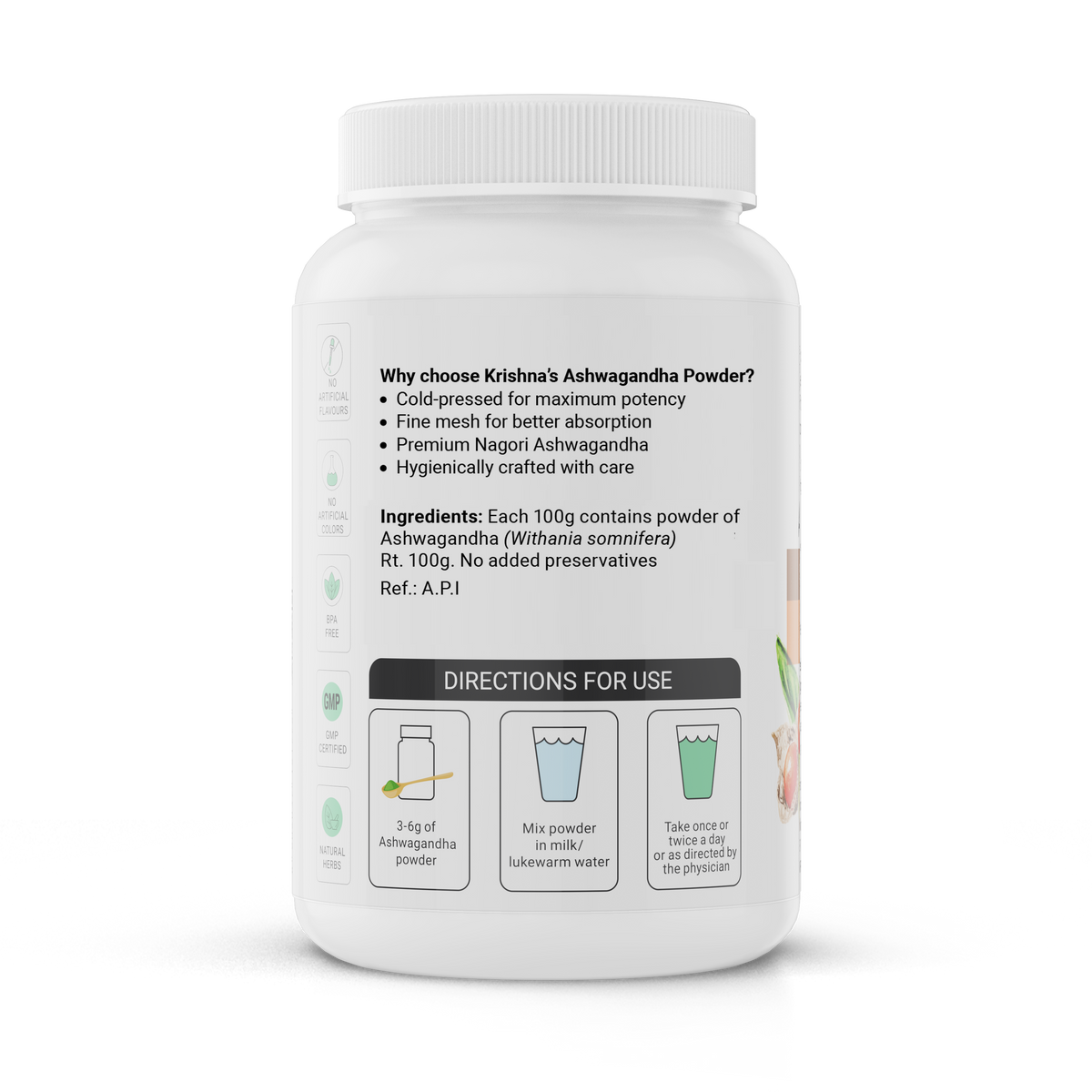 Krishna's Ashwagandha Powder is 100% Organic and is free from pesticides, chemicals or additives. Each bottle contains 100g of Ashwagandha, i.e., Withania Somnifera.Β
