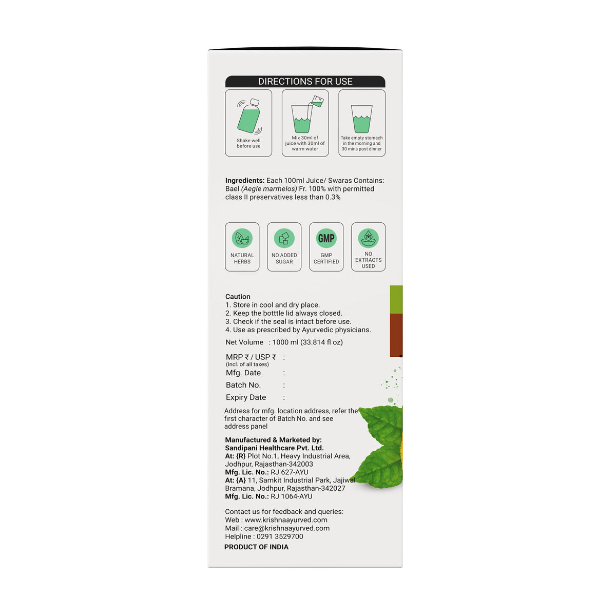 Krishna’s Ayurveda Bael Juice is a sugar-free wellness drink made from fresh, high-quality bael fruit, offering a natural source of dietary fibre to support healthy digestion. This pure formulation is crafted to help keep the body hydrated, deliver a natural cooling effect, and promote digestive wellness in a refreshing, easy-to-consume form.