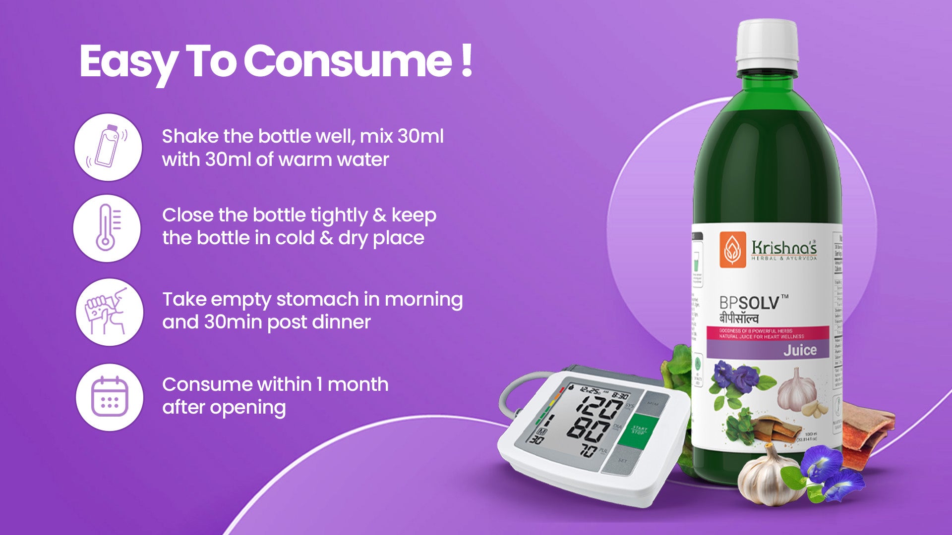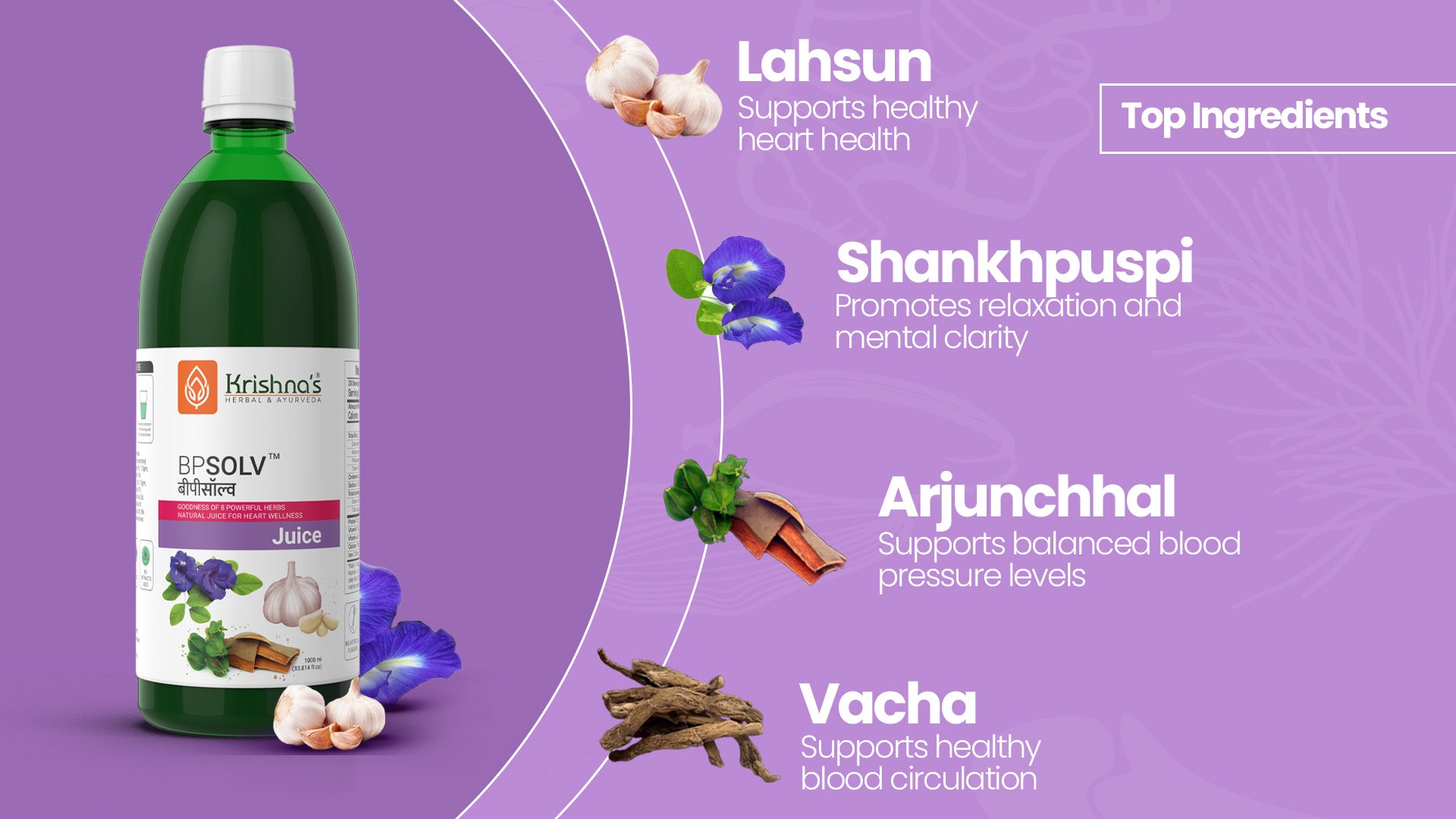 Krishna’s BPSOLV Juice is a natural Ayurvedic blend designed to support healthy blood pressure and heart function. Formulated with powerful herbs like Sarpagandha, Arjun, Jatamansi, Lahsuna, Vacha, Shankhpushpi, and Pushkarmool, it helps regulate blood pressure, strengthen the heart, and boost circulation.