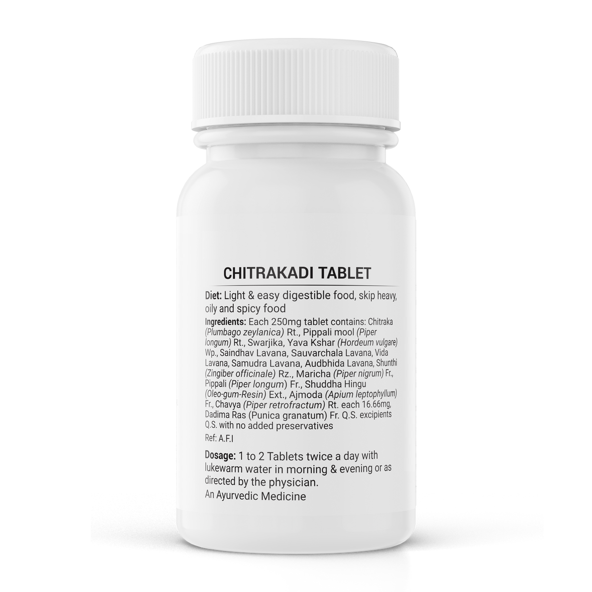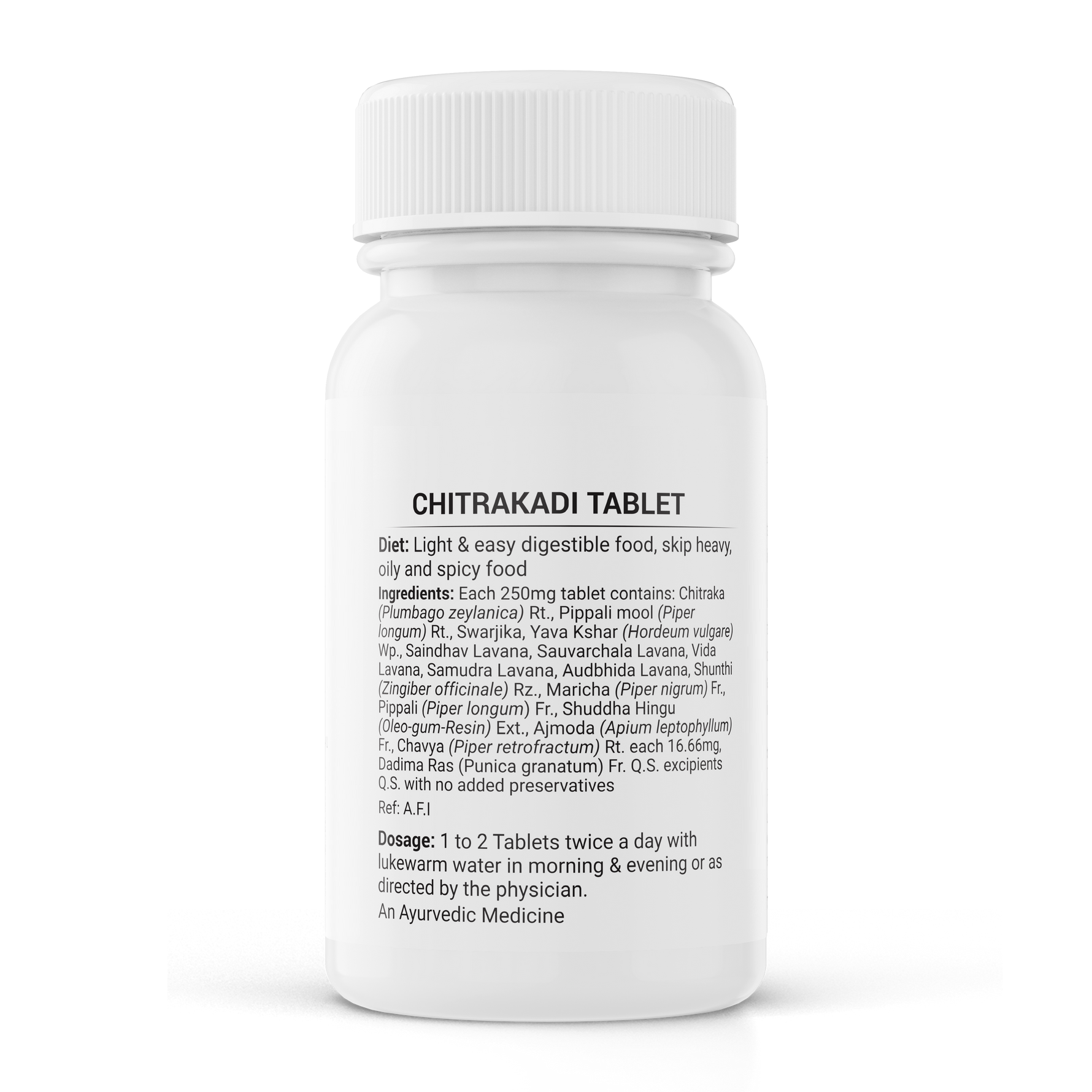 Chitrakadi Vati: Chitrakadi Vati is a classical Ayurvedic herbal formulation used in traditional medicine. It is composed of a combination of herbs and spices, with Chitraka (Plumbago zeylanica) being the primary ingredient. The formulation also typically includes other ingredients such as ginger (Zingiber officinale), black pepper (Piper nigrum), Pippali (Piper longum) and Saindhav Lavana.