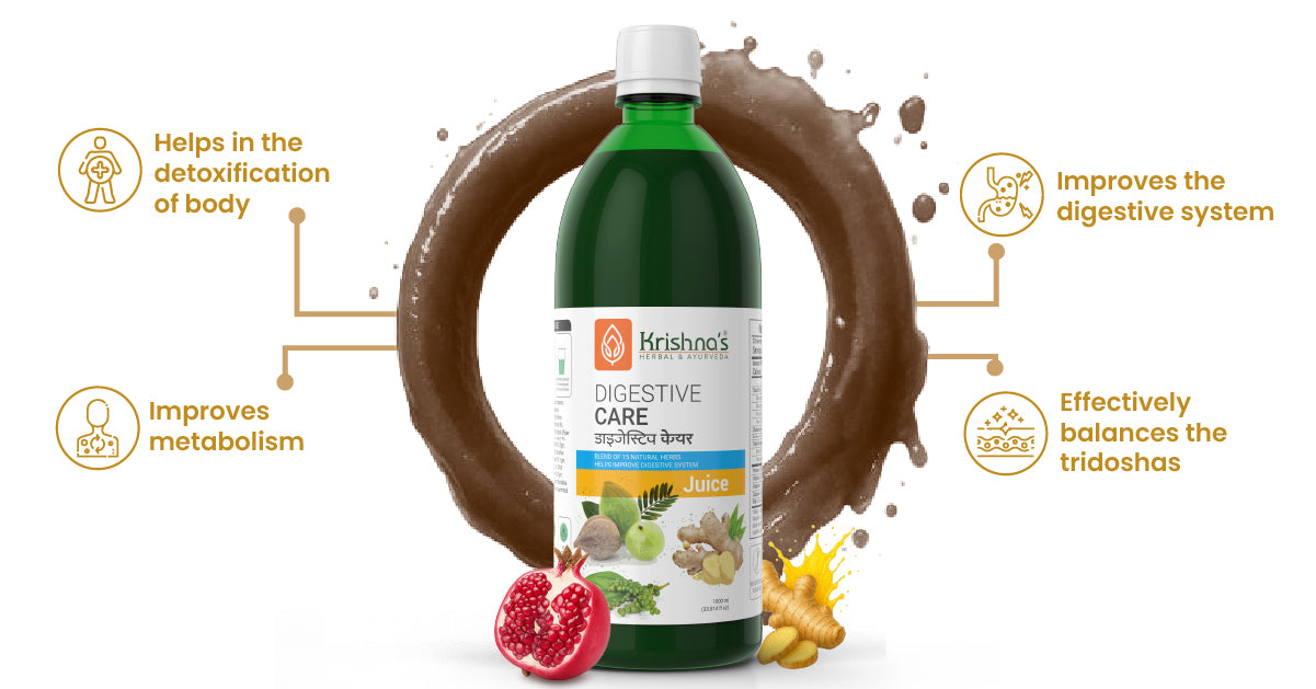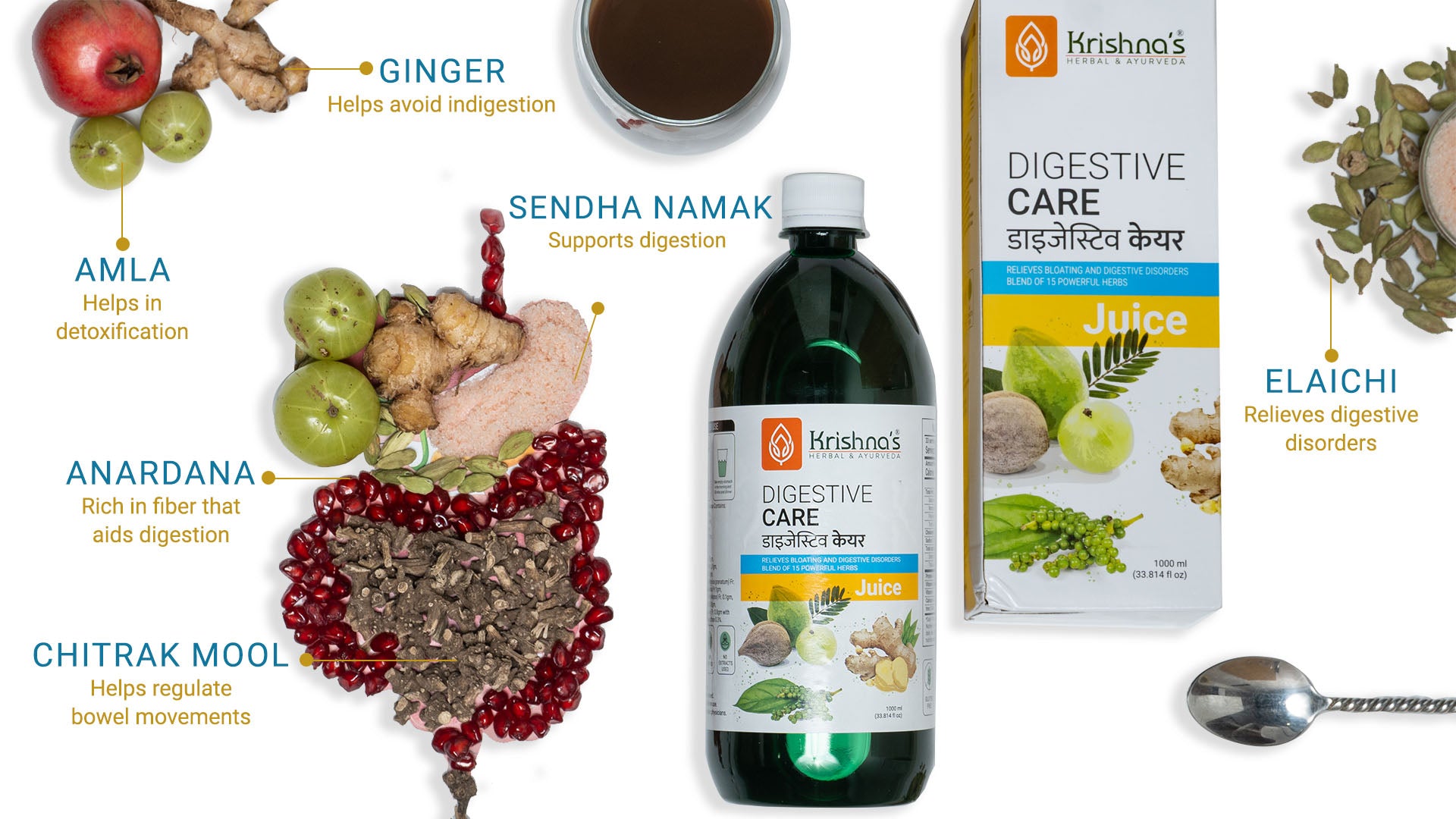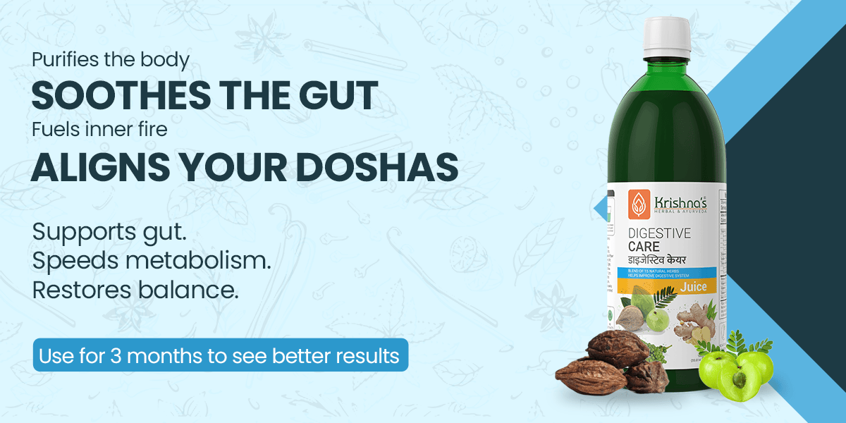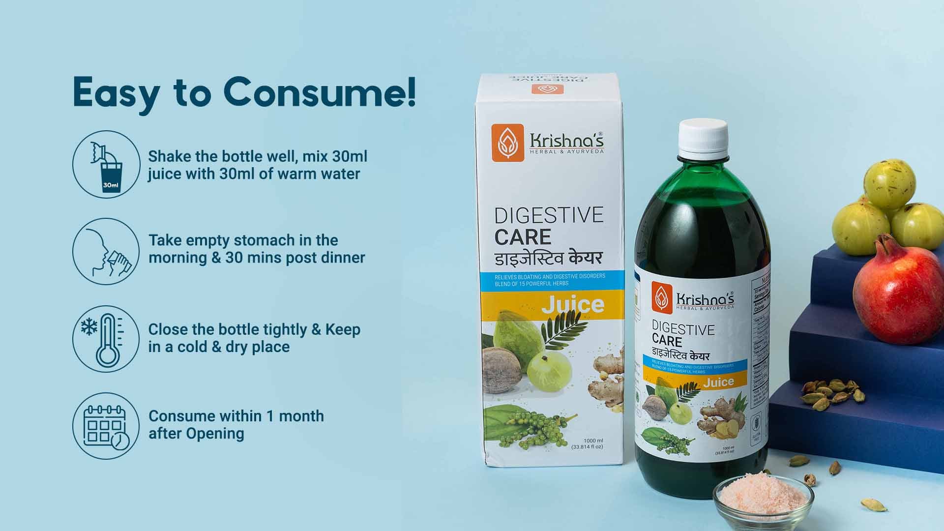Krishna’s Digestive Care Juice provide relief from various digestive issues like bloating and acidity. Say no to sodium-rich antacids that come with side effects, instead, switch to Ayurvedic Digestive Care Juice that addresses the root cause of acidity. Digestive Care Juice is a premium-quality blend of natural ingredients formulated to support and nourish your digestive system. Our juice is made from a blend of wholesome, natural ingredients known for their digestive health benefits, offering you a gentle and effective juice.