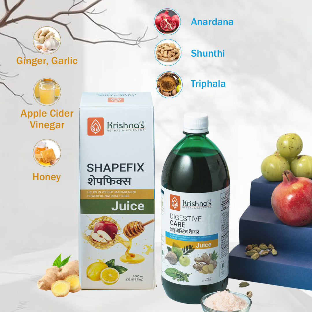 When taken together, these two juices work in harmony to support smooth digestion, natural metabolism, and daily vitality. Digestive Care Juice helps maintain gut balance and comfort, while ShapeFix Juice complements it by promoting active metabolism, detox, and a feeling of lightness. Together, they form a balanced wellness routine that nurtures your inner system and helps you stay refreshed, light, and active throughout the day.