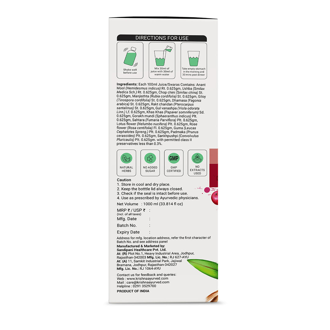 Key Ingredients: Chop Chini, Anant Mool, Ushba, Dhamasa, Gul vanashpa, Gorakh mundi, Manjishtha, Rakt Chandan, Sahtara, Lotus Flower, Rose flower, Guma, Padhyakh, Sankh pushpi and Giloy.