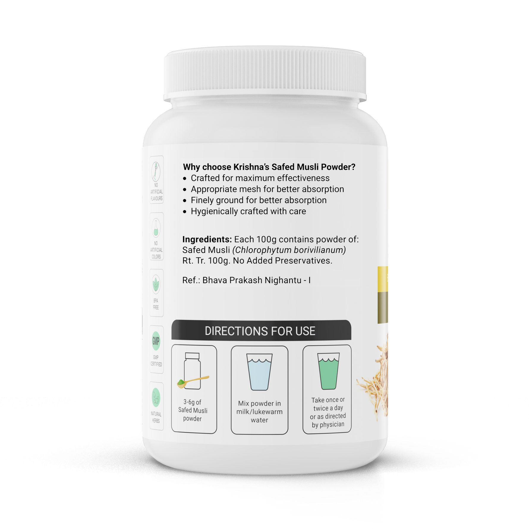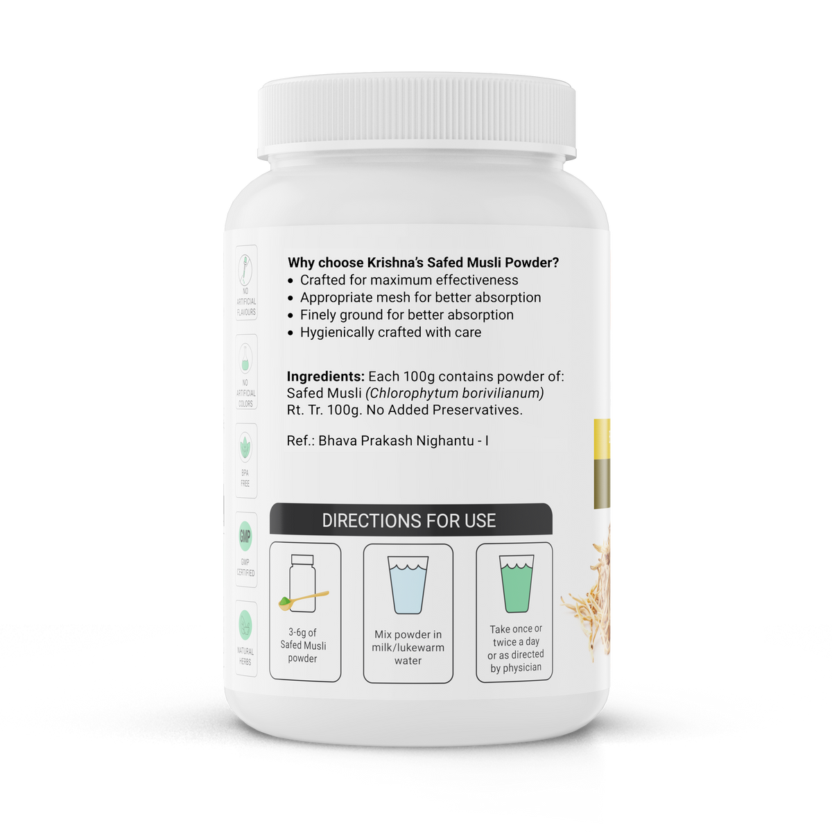 How to Use: Take 1 tsp of Safed Musli powder Mix powder in 1 glass (300 ml) of warm water Take empty stomach in morning & 30 mins post dinner.
