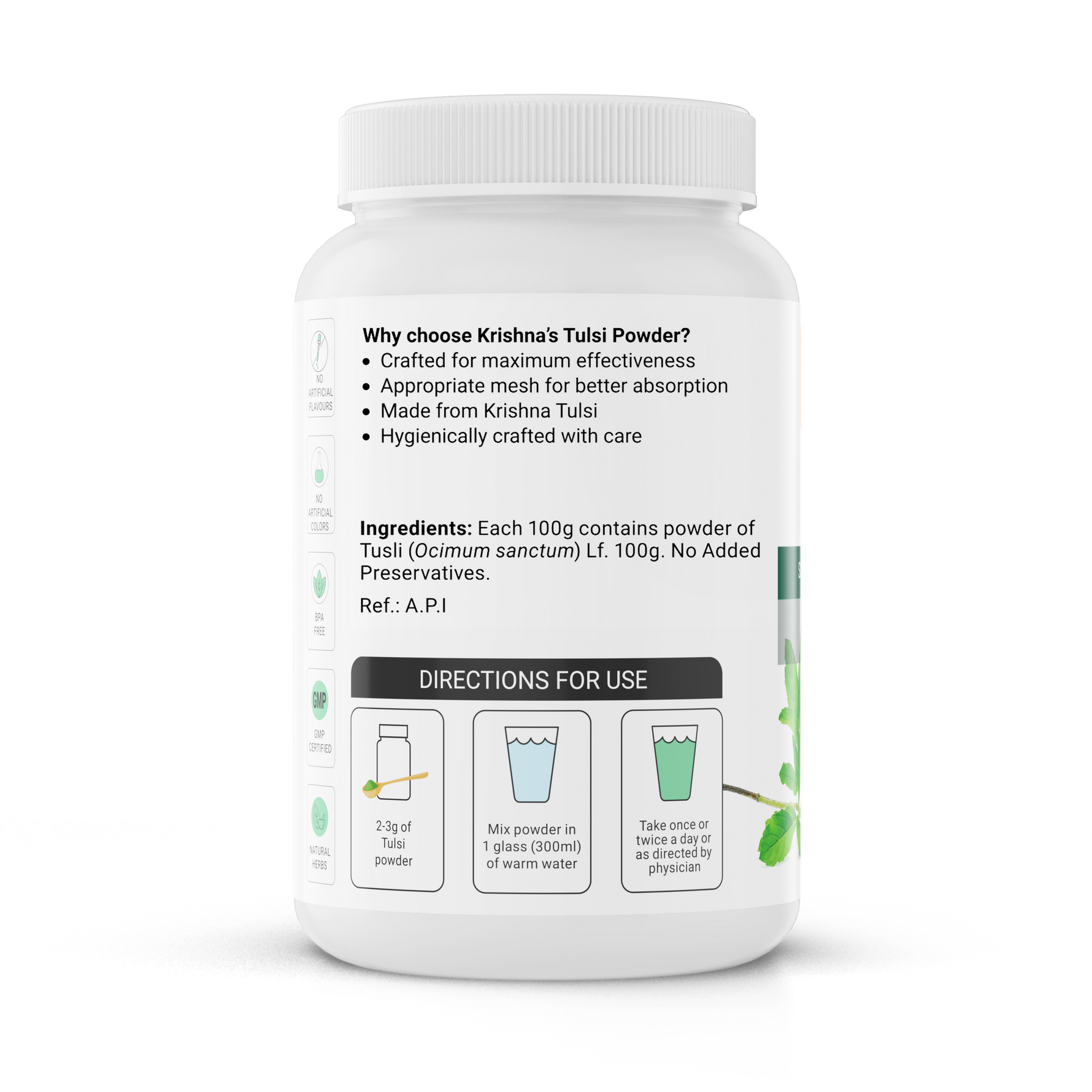 How to Use: Take 1 tsp of Tulsi powder Mix powder in 1 glass (300 ml) of warm water Take empty stomach in morning & 30 mins post dinner.