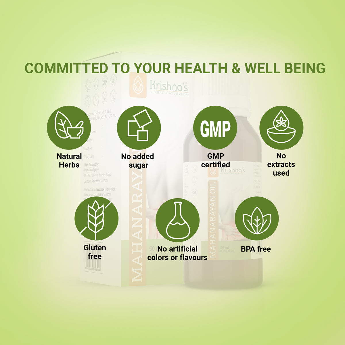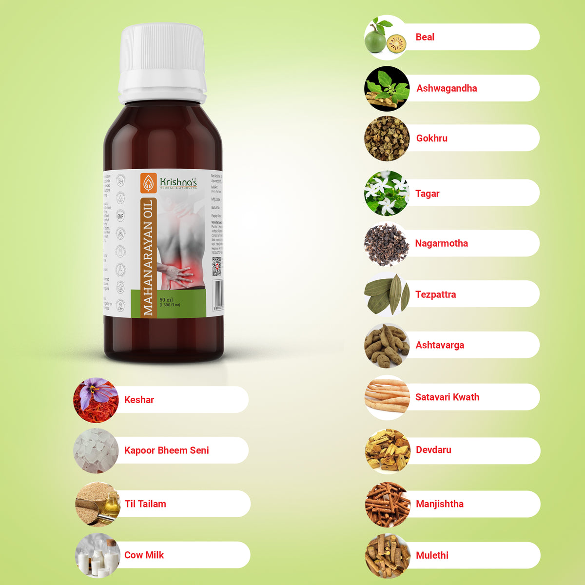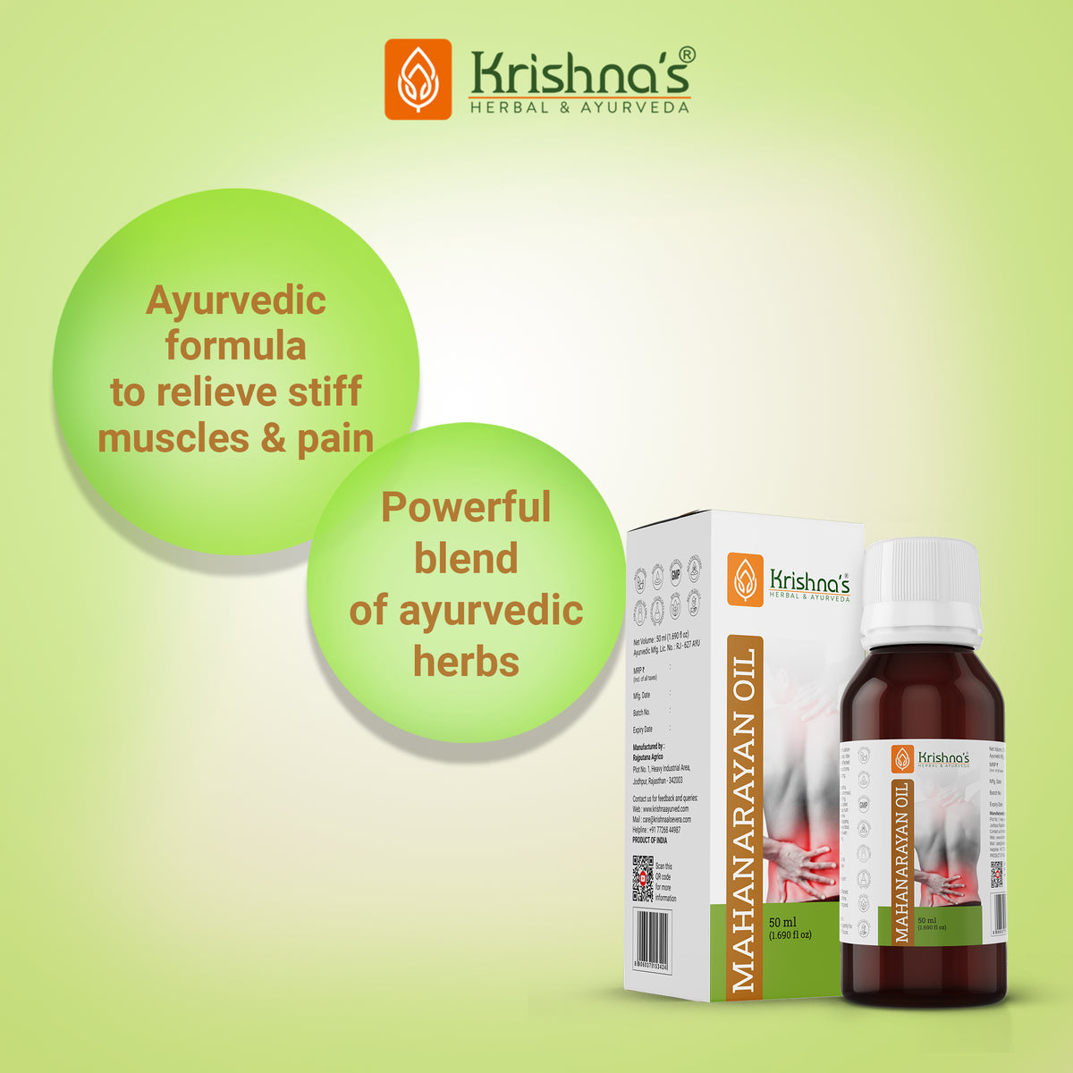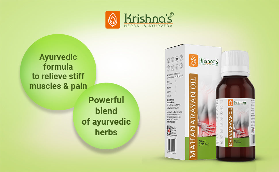 Krishna's Mahanarayan Oil helps ease your sore and tight muscles with Mahanarayan Oil. Our all-natural formula provides relief for stiffness and pain, making it easier for you to move and stay active. Say goodbye to discomfort and hello to a more flexible, pain-free life.