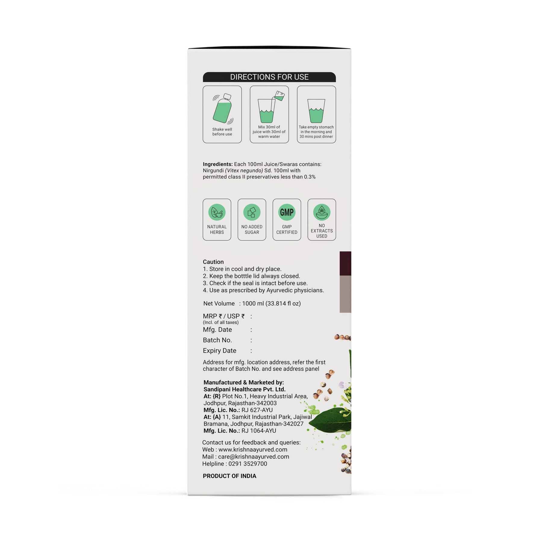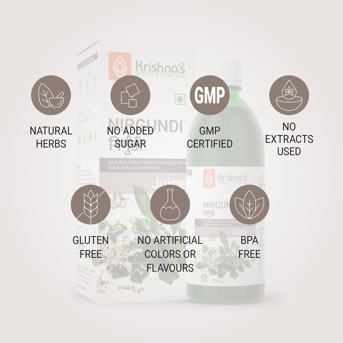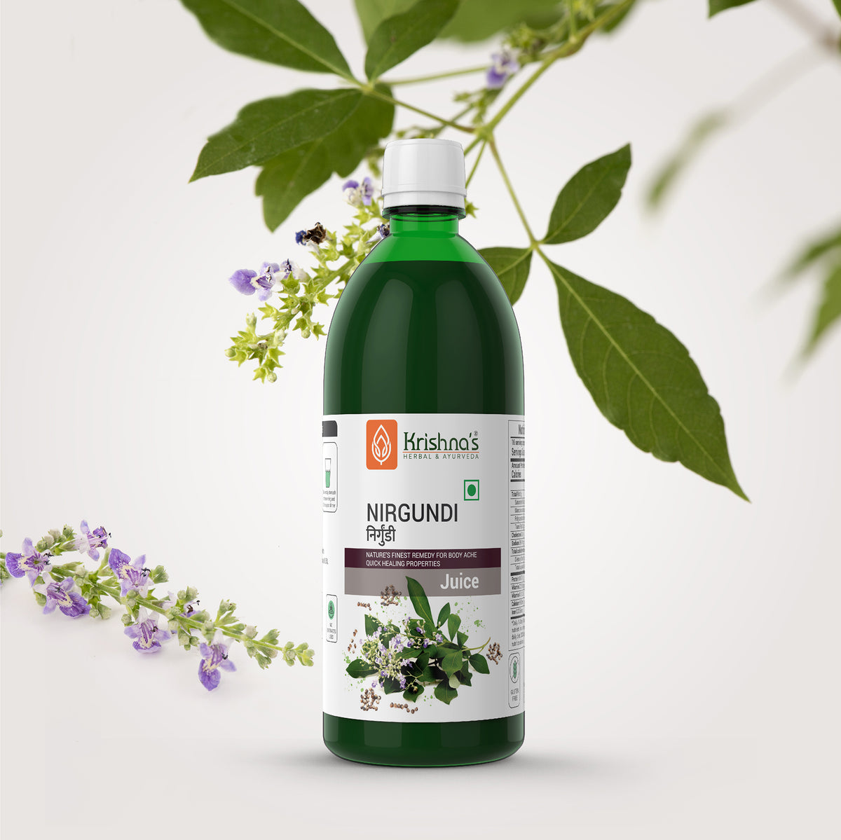 Krishna's Nirgundi juice contains compounds that possess anti-inflammatory properties, which may help reduce inflammation and alleviate pain. Nirgundi is considered beneficial for respiratory health in Ayurveda. It is used to alleviate respiratory problems.