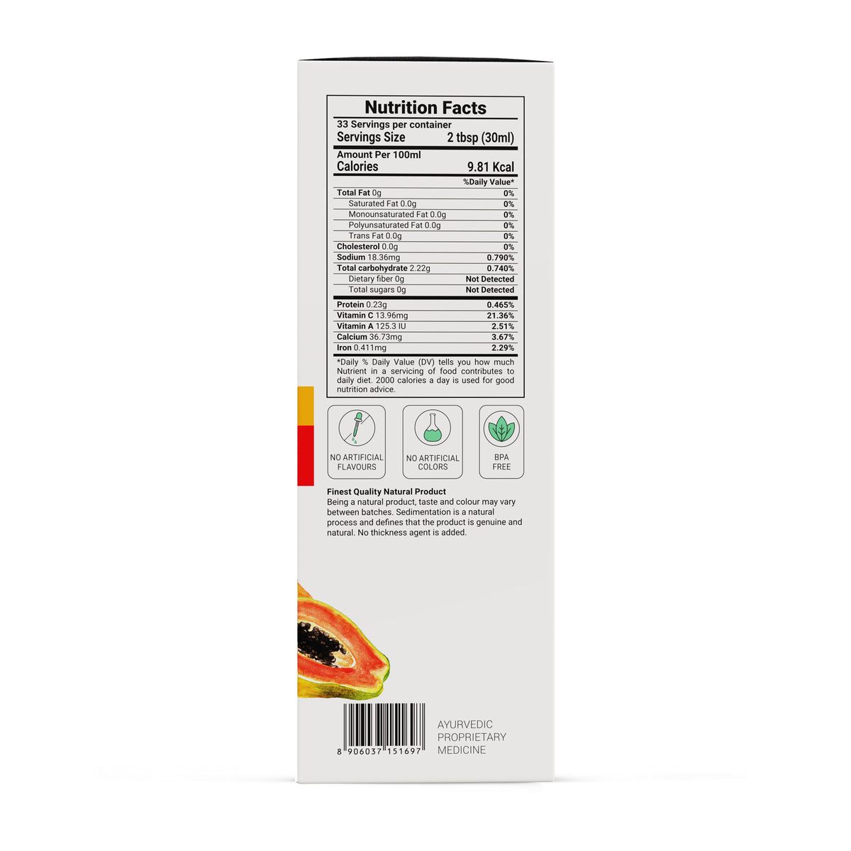 The Krishna's Herbal & Ayurveda Papaya Leaf Juice contains pure extracts of papaya leaf with all their nutritional values intact. Like papaya, the papaya leaves are also full of nutrients that help you to maintain your digestion while balancing the gastric juices. Its a rich source of Vitamin A & C.