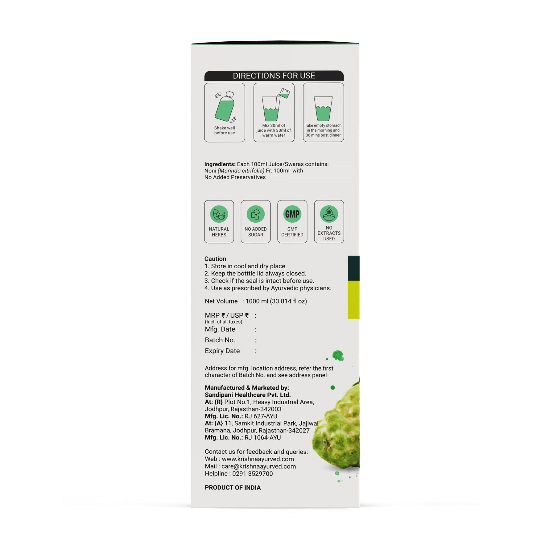 Krishna’s Raw Noni Juice is made from organic Noni Fruit Morinda citrifolia and is not reconstituted from concentrate, puree, or powder. Our Noni Juice is GMP Certified, Organic. It is not pasteurized and is filled to order at our farm. Krishna’s Raw Noni Juice is free from additives and contains no sugar, water, fruit juices, or other added flavours. Each 100 ml of Krishna’s Raw Noni Juice contains 100 ml of pure and raw noni juice with no added preservatives.