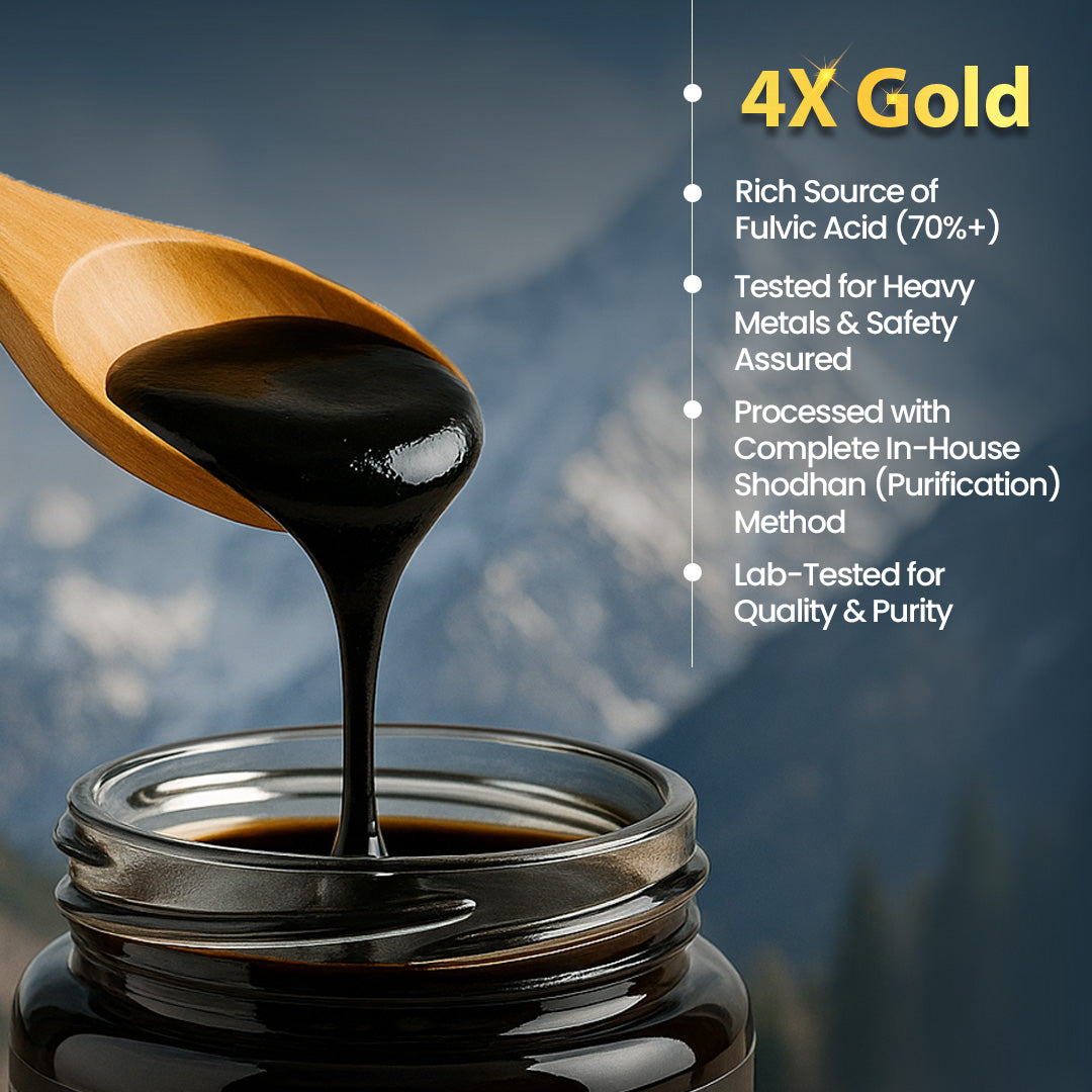 During the summer months, due to intense sunlight, this nutrient-rich resin melts and seeps through rock layers, where it is carefully collected and purified using traditional Ayurvedic methods.
