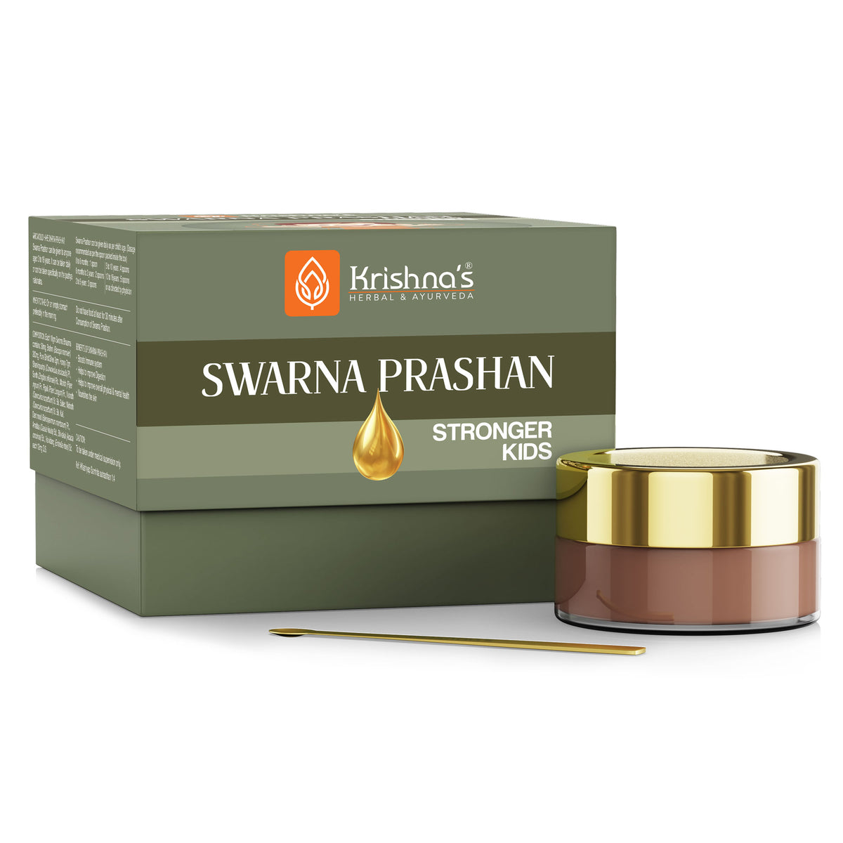 “Swarnaprashana'' is an ancient Ayurvedic practice of administering pure gold bhasma to kids to make them stronger. Krishna’s Swarna Prashan drops can be given to kids aged between 0 to 16 years. Swarna Prashan is prepared with swarna bhasma (gold ash) and every 10 grams of Krishna’s Swarna Prashan contains 30 mg of swarna bhasma. Swarna Prashan is prepared by mixing swarna bhasma with honey and Brahmi ghrit or ghee. Brahmi Ghrit contains Brahmi, Dantimool, Shankhpushpi, Amaltas, Sonth, Shikakai, Mariach, Vaividang, Pipali, Nishoth Kali, and Nishoth.