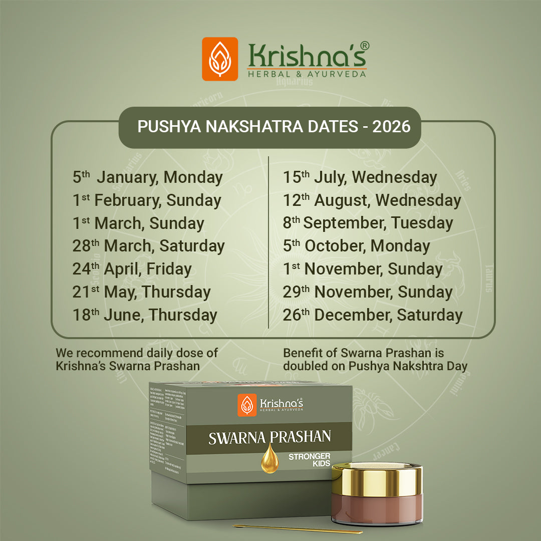 Krishna’s Swarna Prashan has the maximum purest gold bhasma in every drop, and a daily dose of these drops is recommended for kids. Swarnaprashan with gold is made in small batches by Vaidya's on auspicious Nakshatra. Swarnaprashan benefits double on Pushya Nakshatra Day.