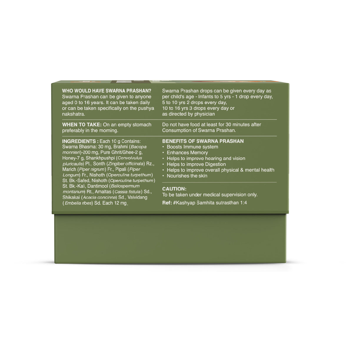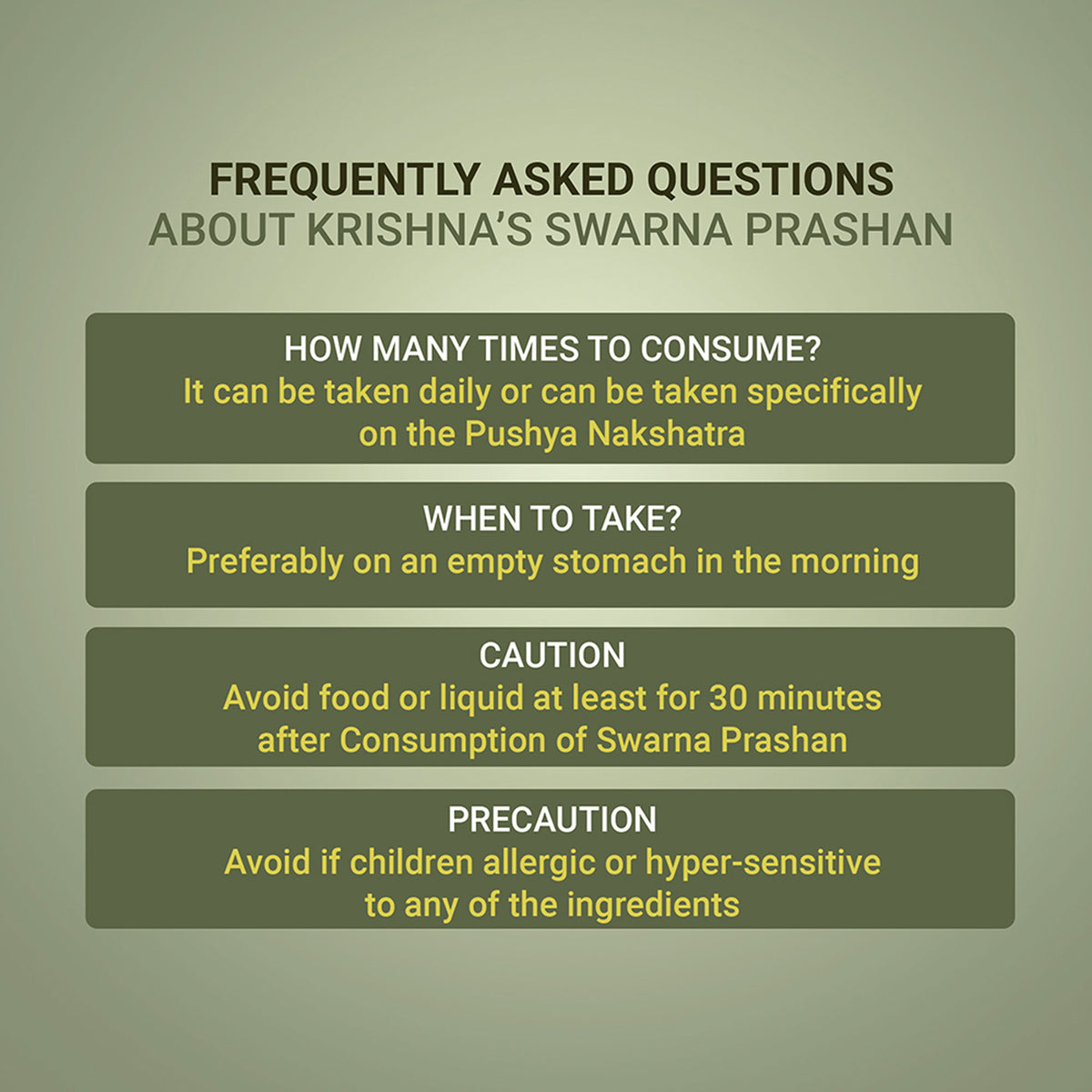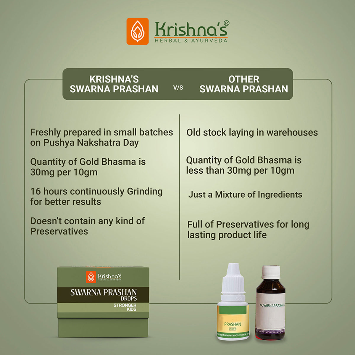 “Swarnaprashana'' is an ancient Ayurvedic practice of administering pure gold bhasma to kids to make them stronger. Krishna’s Swarna Prashan drops can be given to kids aged between 0 to 16 years. Swarna Prashan is prepared with swarna bhasma (gold ash) and every 10 grams of Krishna’s Swarna Prashan contains 30 mg of swarna bhasma. Swarna Prashan is prepared by mixing swarna bhasma with honey and Brahmi ghrit or ghee. Brahmi Ghrit contains Brahmi, Dantimool, Shankhpushpi, Amaltas, Sonth, Shikakai, Mariach, Vaividang, Pipali, Nishoth Kali, and Nishoth.