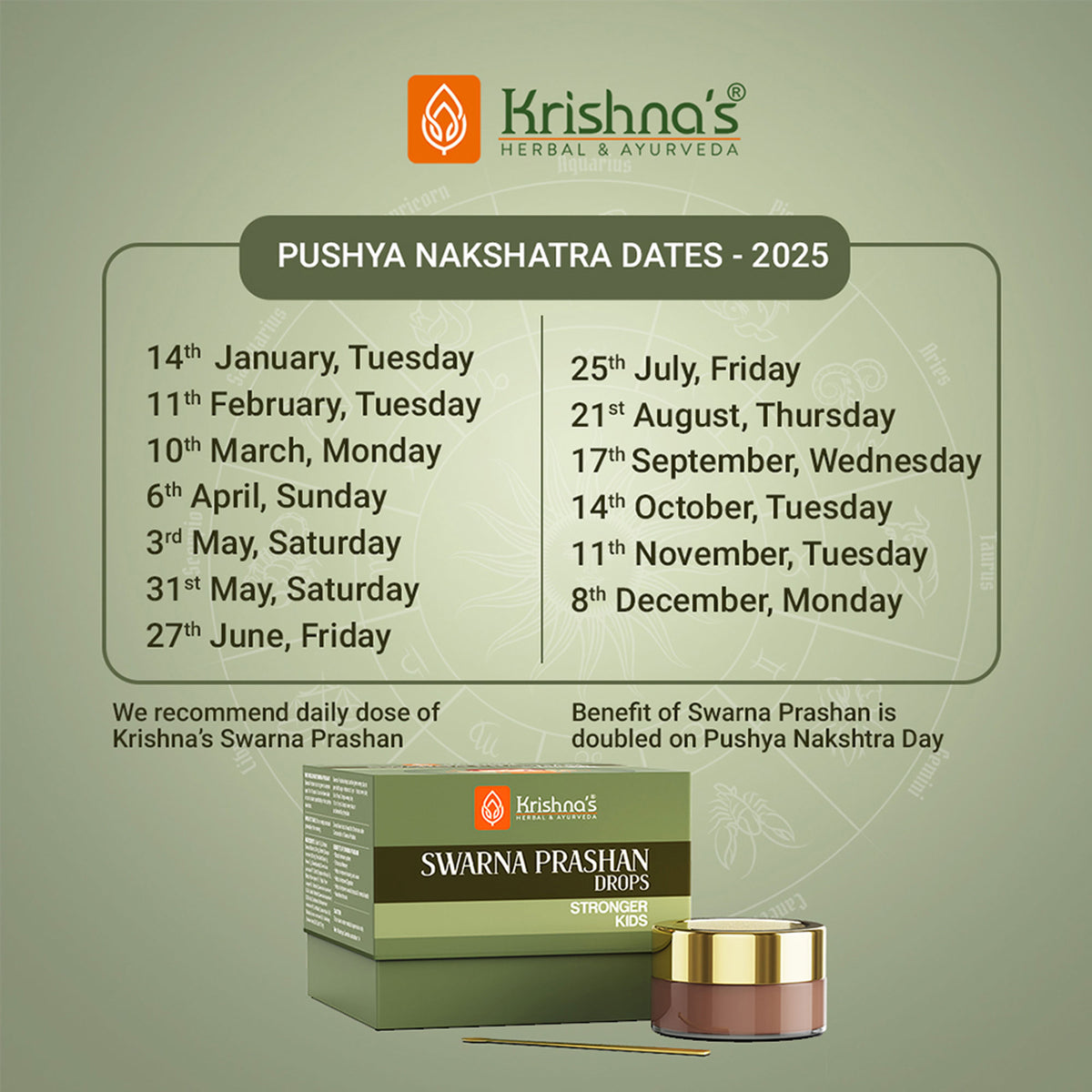 Krishna’s Swarna Prashan has the maximum purest gold bhasma in every drop, and a daily dose of these drops is recommended for kids. Swarnaprashan with gold is made in small batches by Vaidya's on auspicious Nakshatra. Swarnaprashan benefits double on Pushya Nakshatra Day.