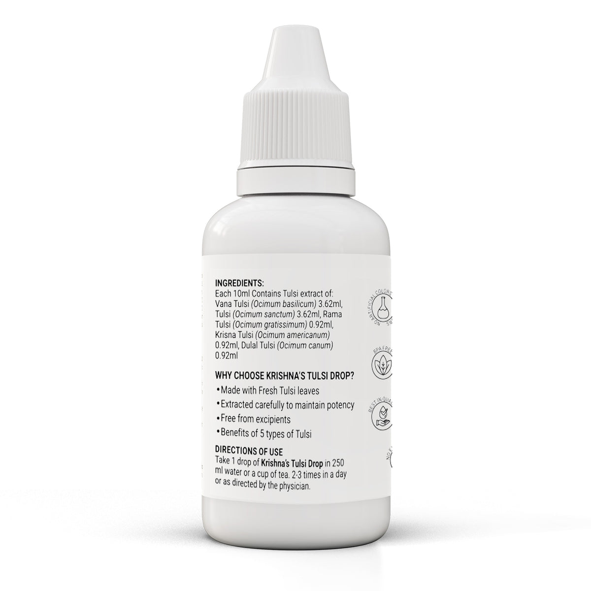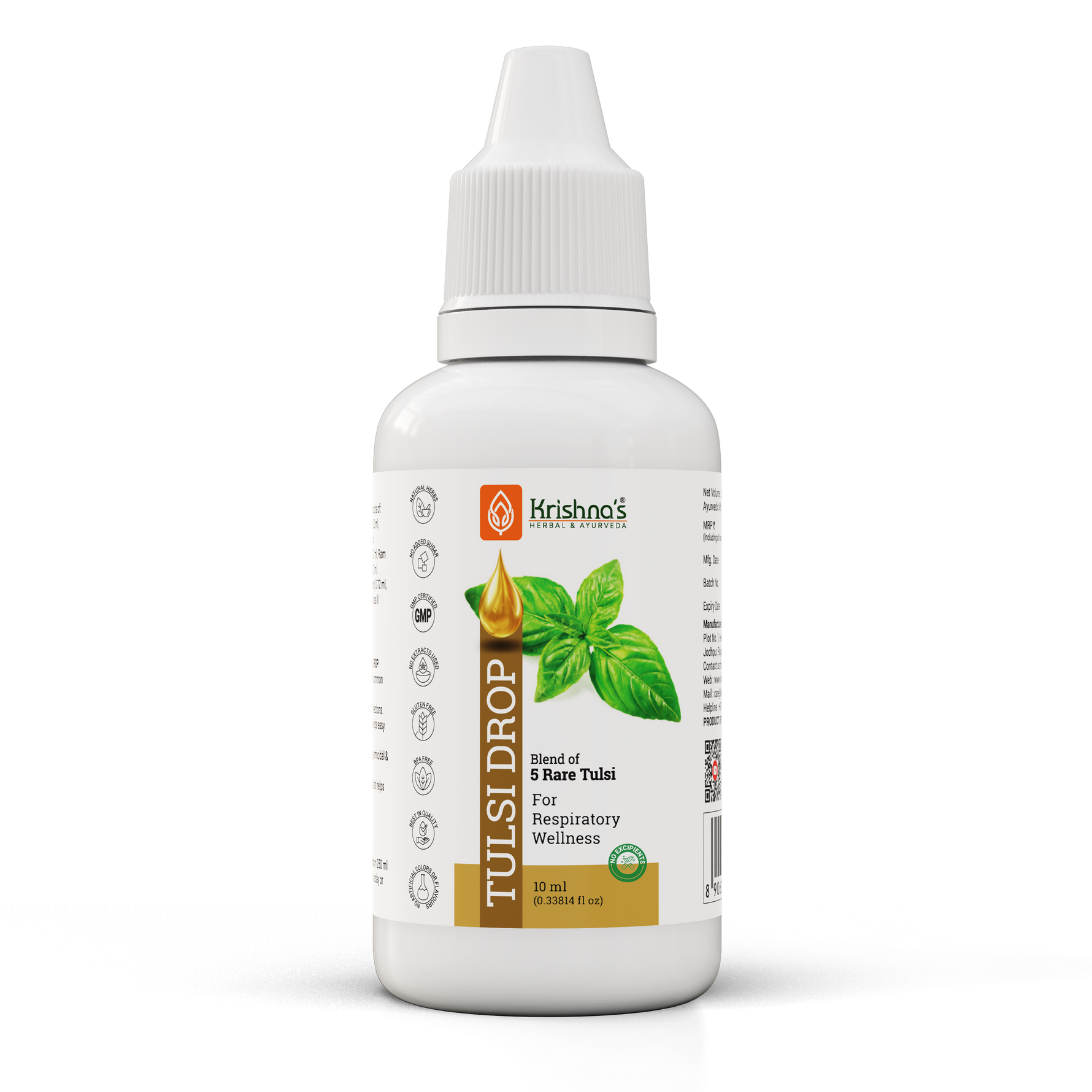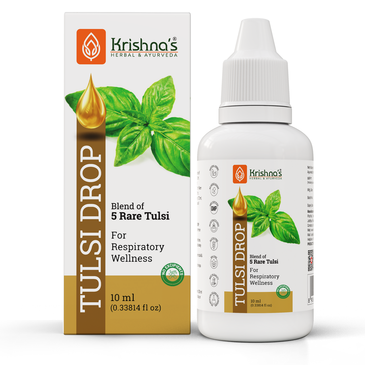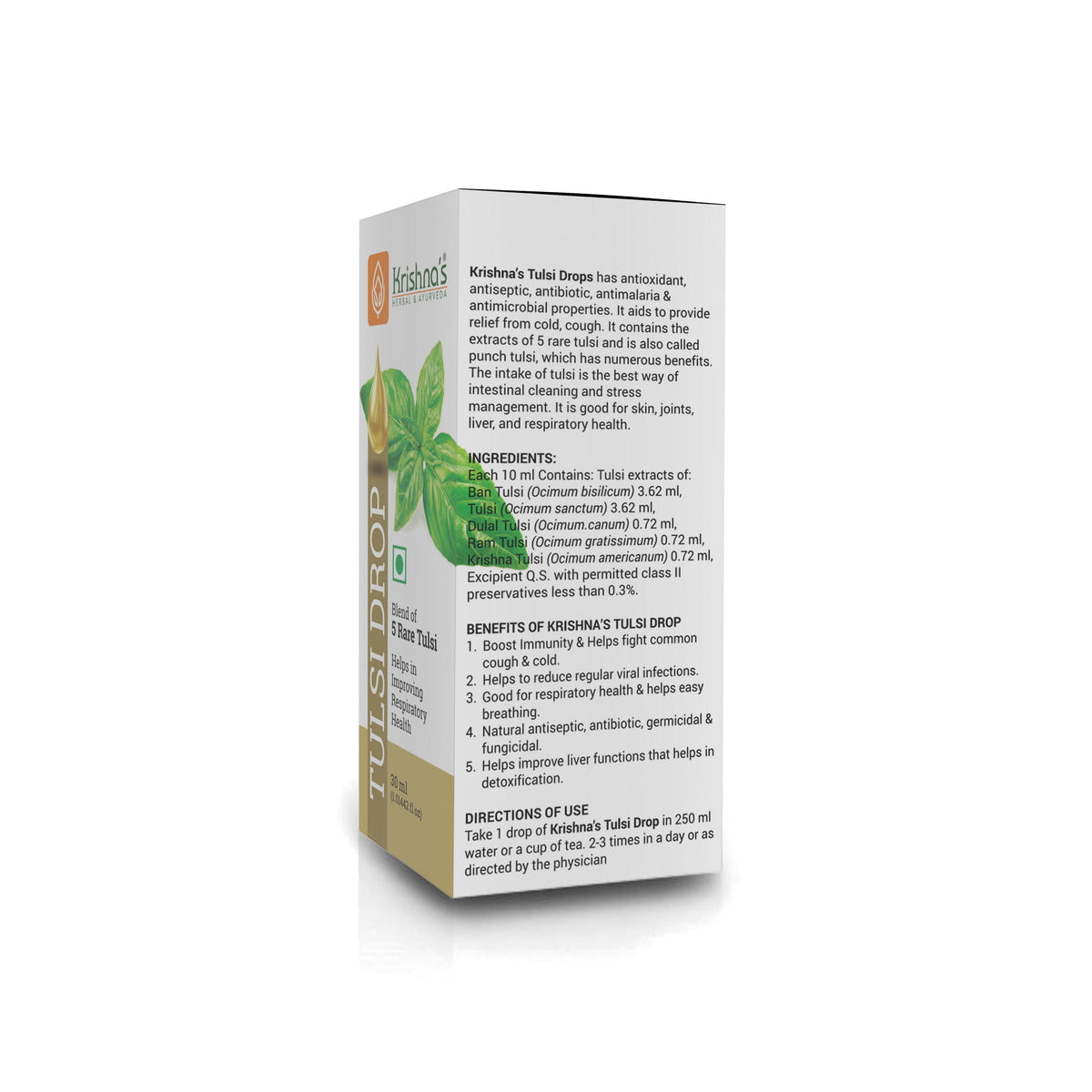 Each 10 ml of Krishna Tulsi Drop contains extracts of Shyam Tulsi 2.0 ml, Dulal Tulsi 2.0 ml, Ram Tulsi 2.0 ml, Nimbu Tulsi 2.0 ml, Van Tulsi 2.0 ml, Excipient 0.5 ml with permitted class II preservatives less than 0.3%.