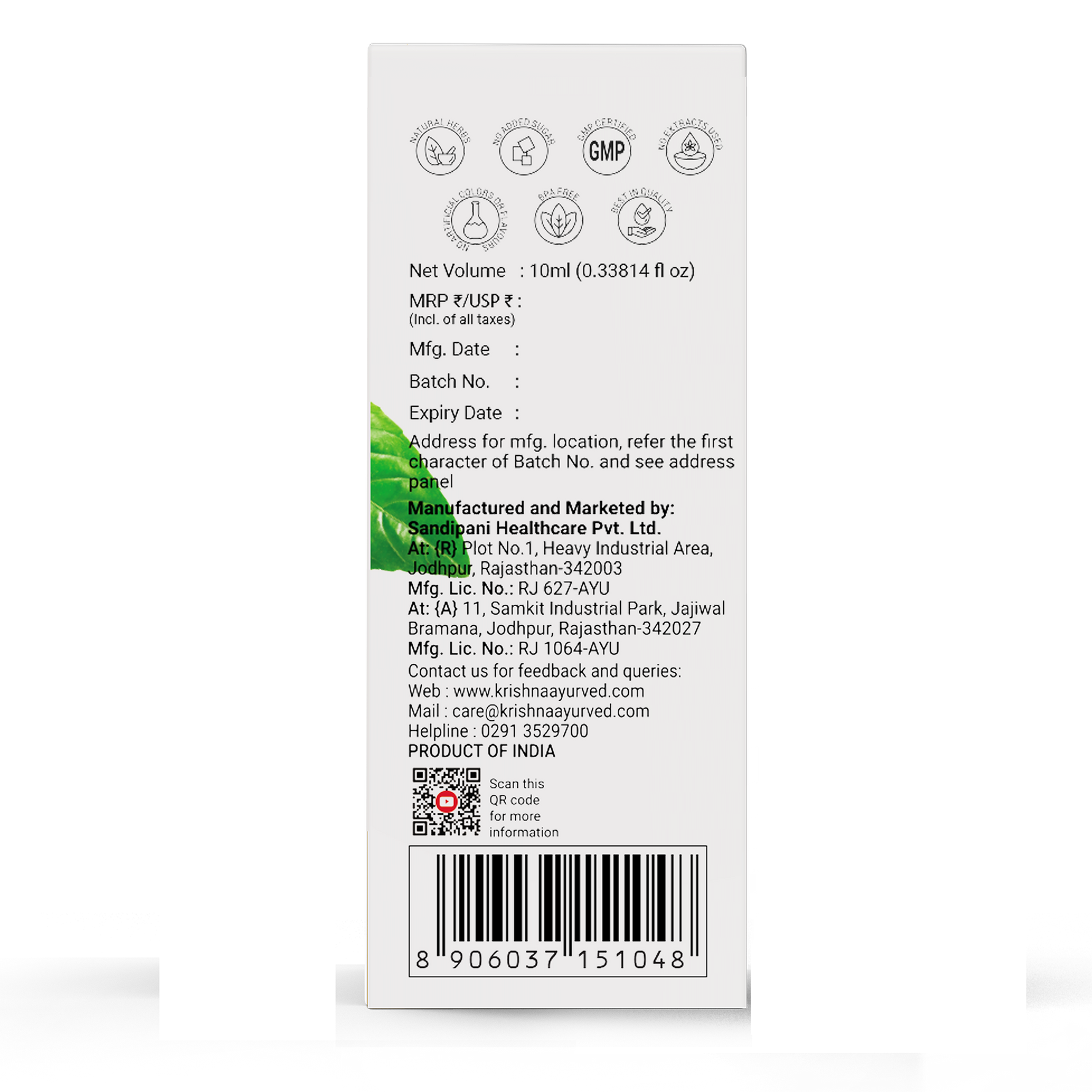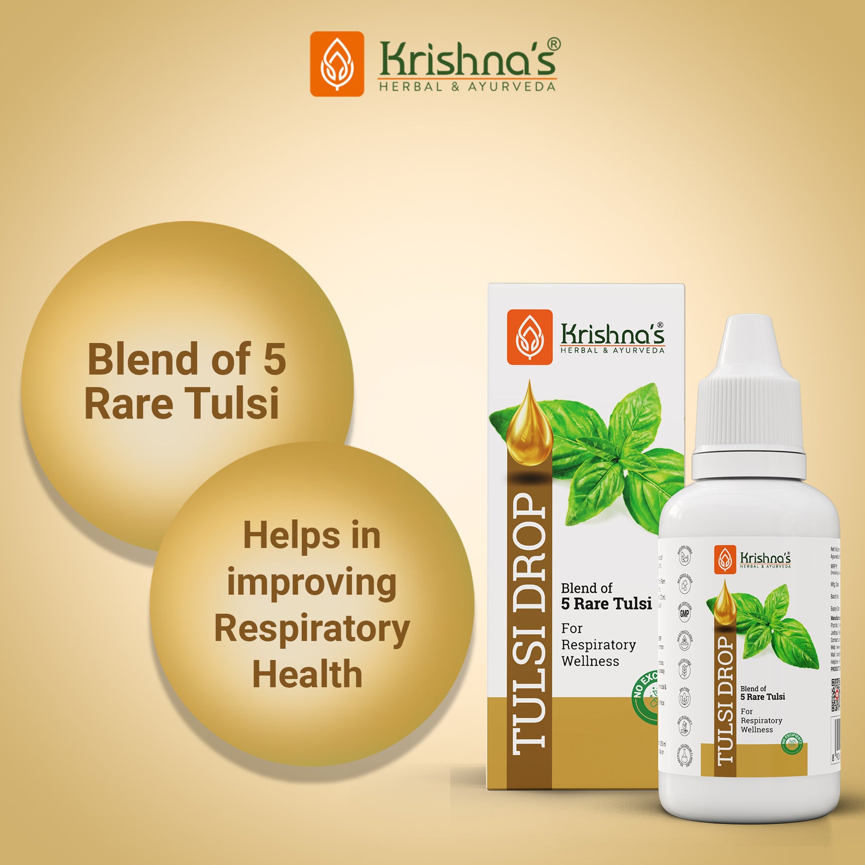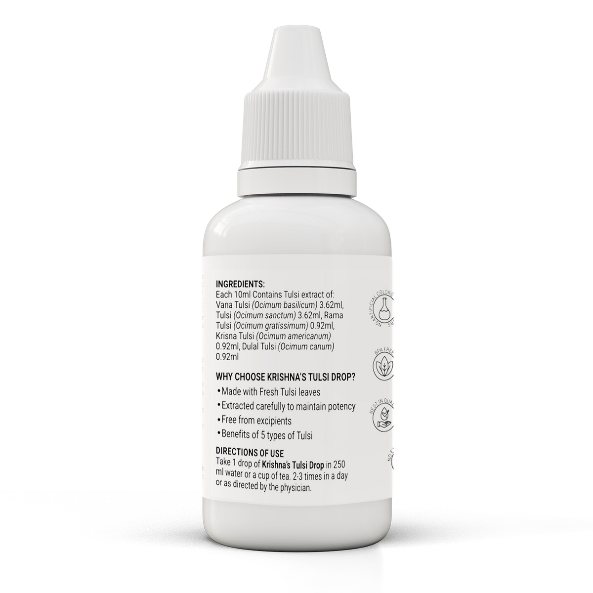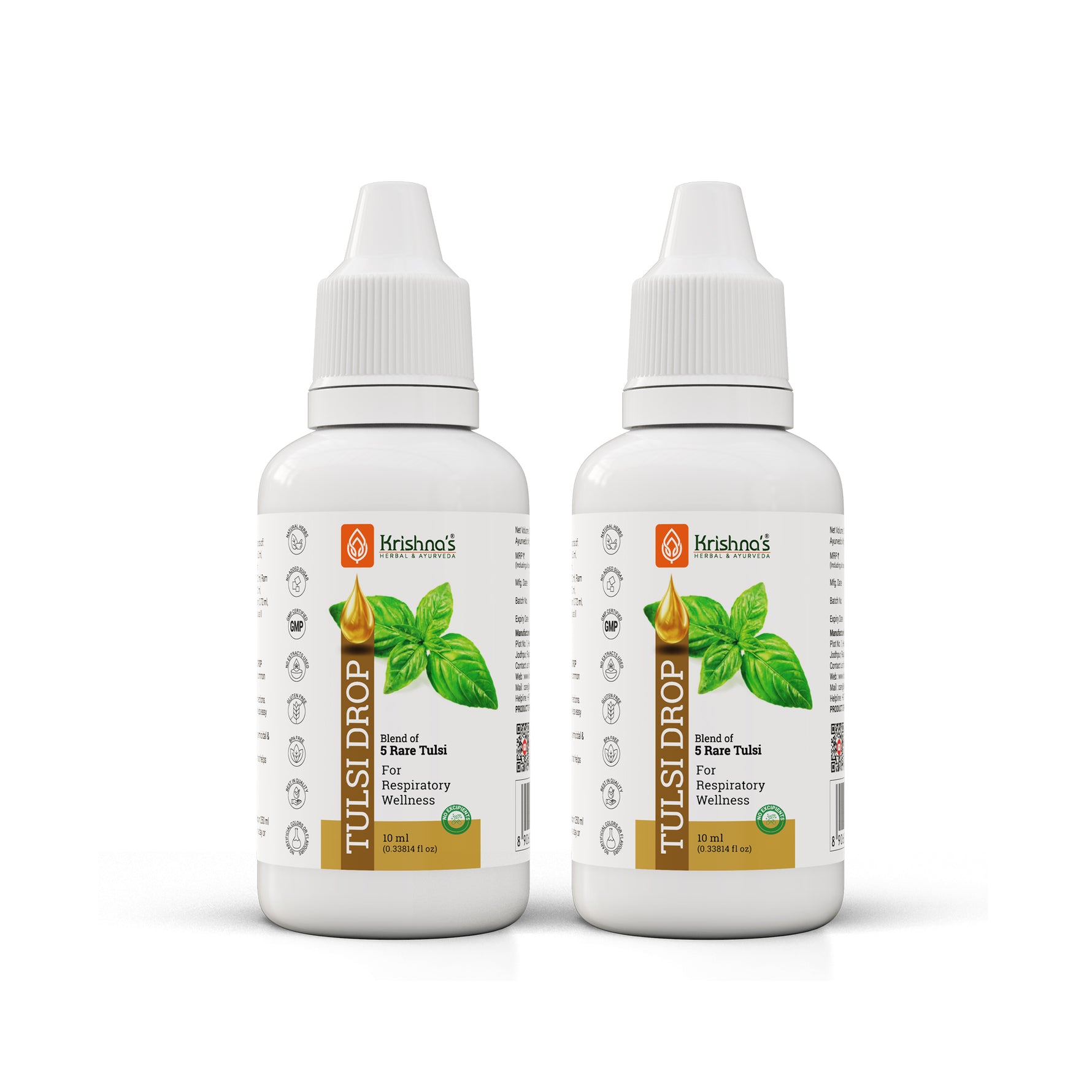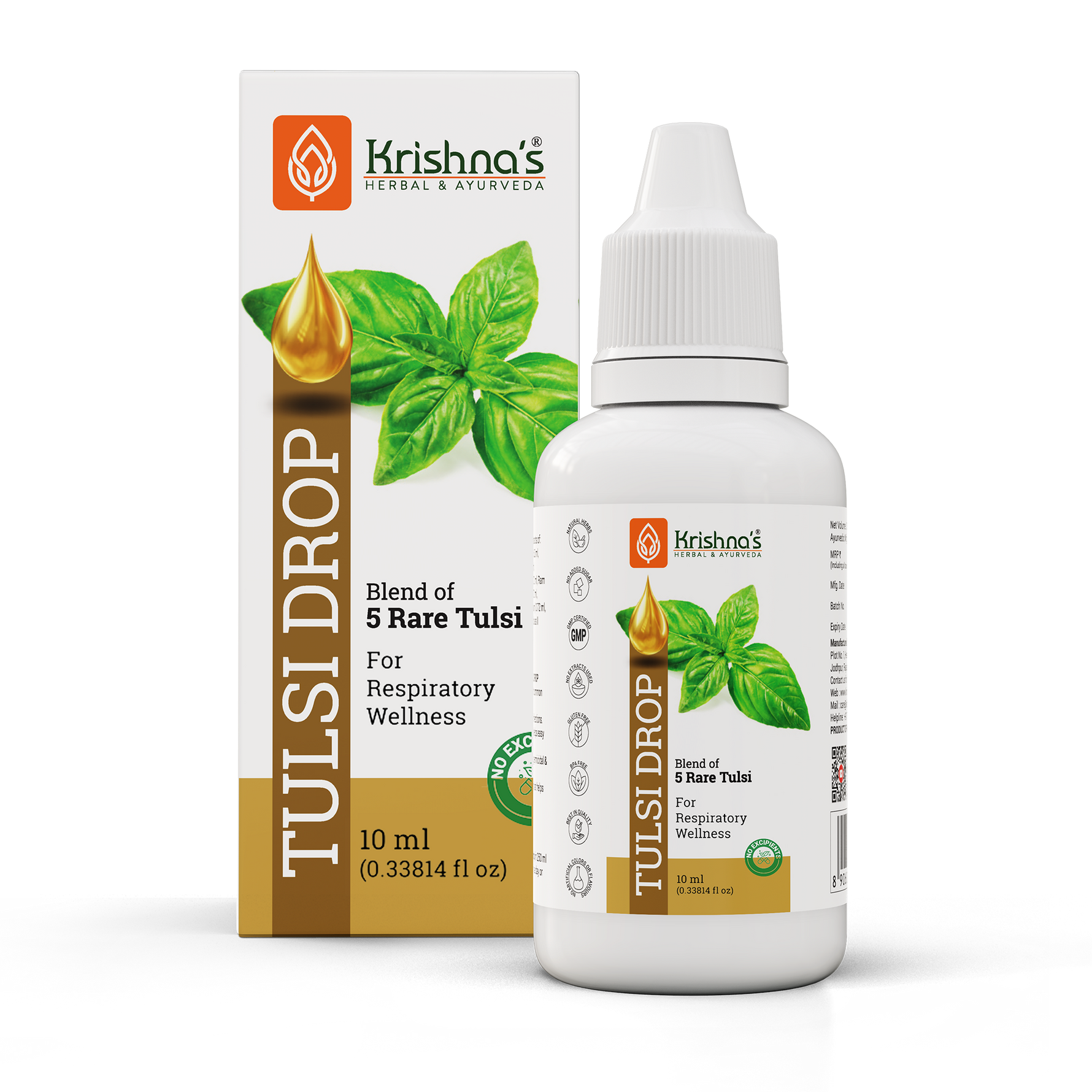 Each 10 ml of Krishna Tulsi Drop contains extracts of Shyam Tulsi 2.0 ml, Dulal Tulsi 2.0 ml, Ram Tulsi 2.0 ml, Nimbu Tulsi 2.0 ml, Van Tulsi 2.0 ml, Excipient 0.5 ml with permitted class II preservatives less than 0.3%.